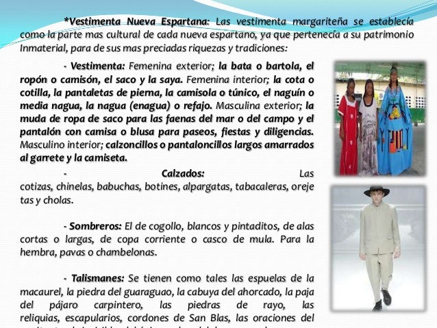 - femenina: la vestimenta femenina del estado nueva esparta se destaca por: la bata o bartola, el ropón o camisón, el saco y la saya.